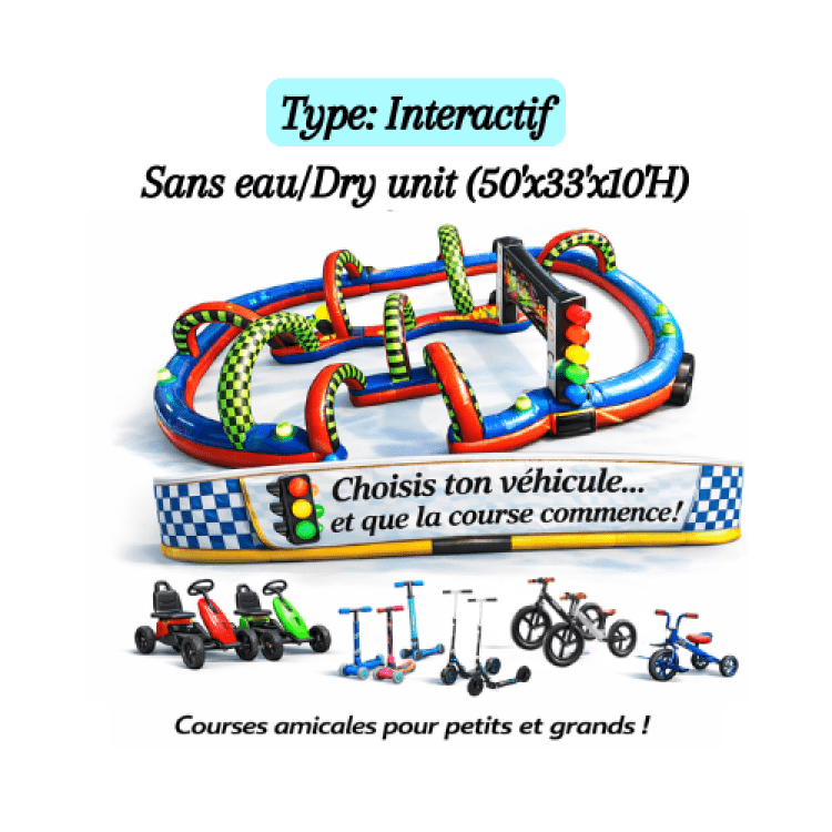 Notre piste de course gonflable transformera votre événement en véritable circuit où les jeunes pilotes pourront rouler, s’amuser et relever le défi de la course en toute sécurité. Colorée et impressionnante, elle créera instantanément une zone d’activité dynamique qui attirera petits et grands.